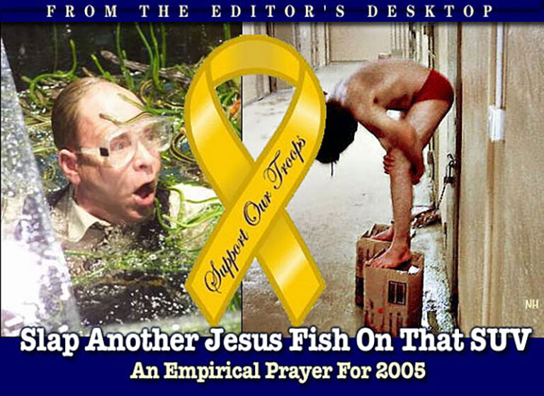 I am convinced that when people put Jesus Fish, “Support Our Troops” ribbons and even American Flag or, sadly enough, “Remember 9/11” magnets on their vehicle, they are making political statements more than anything else. It is all thinly veiled “Vote Republican” merchandise. You can be reasonably sure that virtually none of the people behind the wheel voted for John Kerry and they would be just as comfortable with a “Stamp Out Alternative Lifestyles and Non-Christian Religions” bumper sticker if they thought they could get away with it. The fact that their Christian Right Wing agenda has become so successfully entwined with patriotism and love of liberty is just one more example of the astonishingly Orwellian (read Fascist) manipulations we have undergone in a short period of time. If there is any real hope for this country and the world we are a vital part of, it rests in tolerance, a government free of religious influence, and everything else contained in that wonderful Bill Of Rights that made us the envy of the world for so long. It’s not that complicated, almost self-evident: